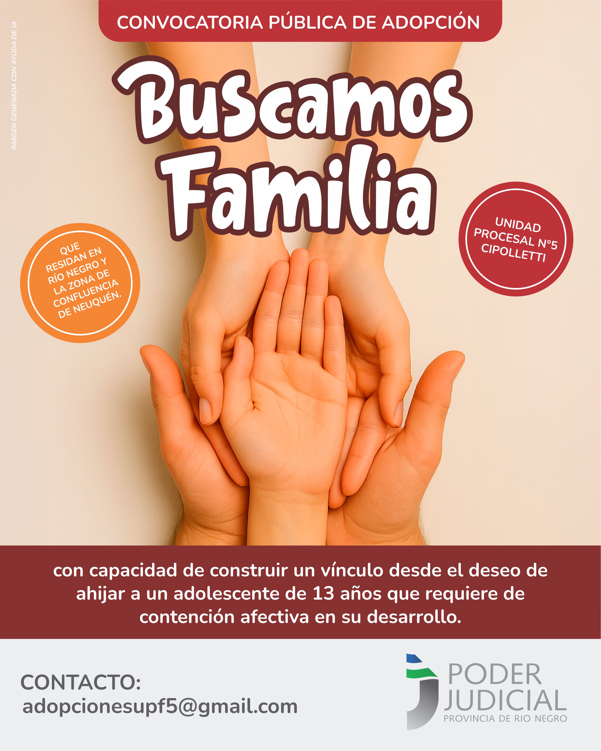 Para más información, pueden comunicarse con el Juzgado de Familia de Cipolletti (299) 4380932 o por correo electrónico a adopcioncipolletti@gmail.com.