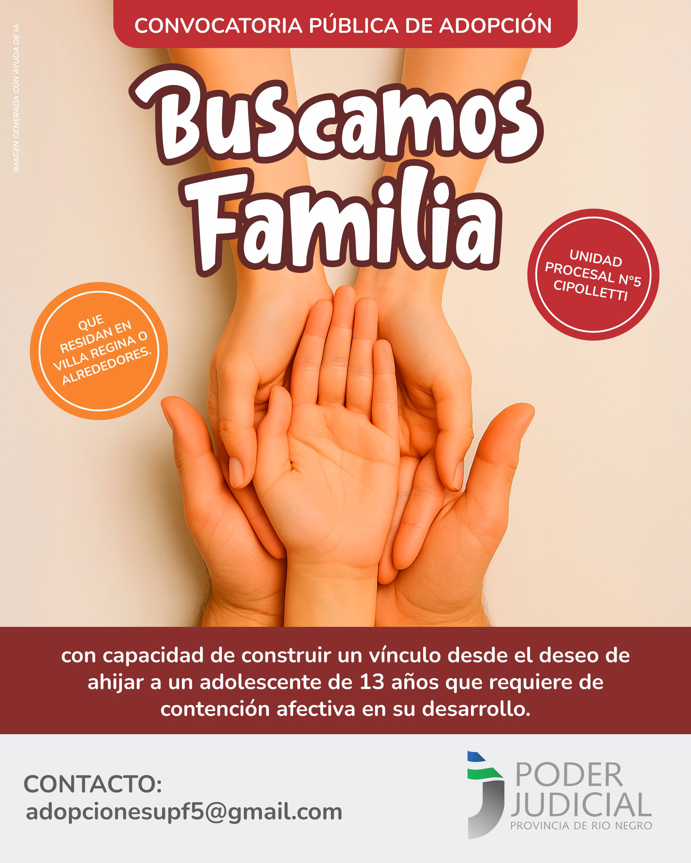 La Unidad Procesal N° 5 del Fuero de Familia de Cipolletti, Provincia de Río Negro, a través del Registro Único de Aspirantes a Guarda con Fines Adoptivos, convoca a familias que deseen adoptar a un adolescente de 13 años de edad.